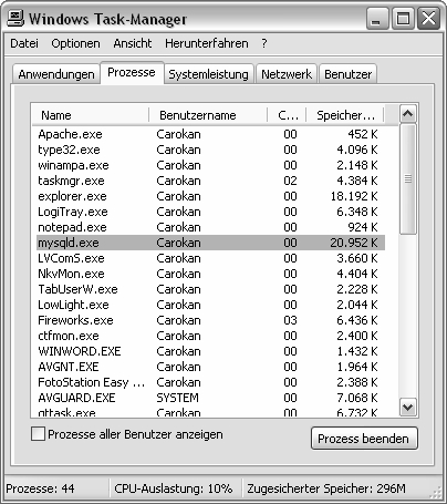Bild 2.14: Taskleiste, in der mysql als Prozess aufgeführt wird