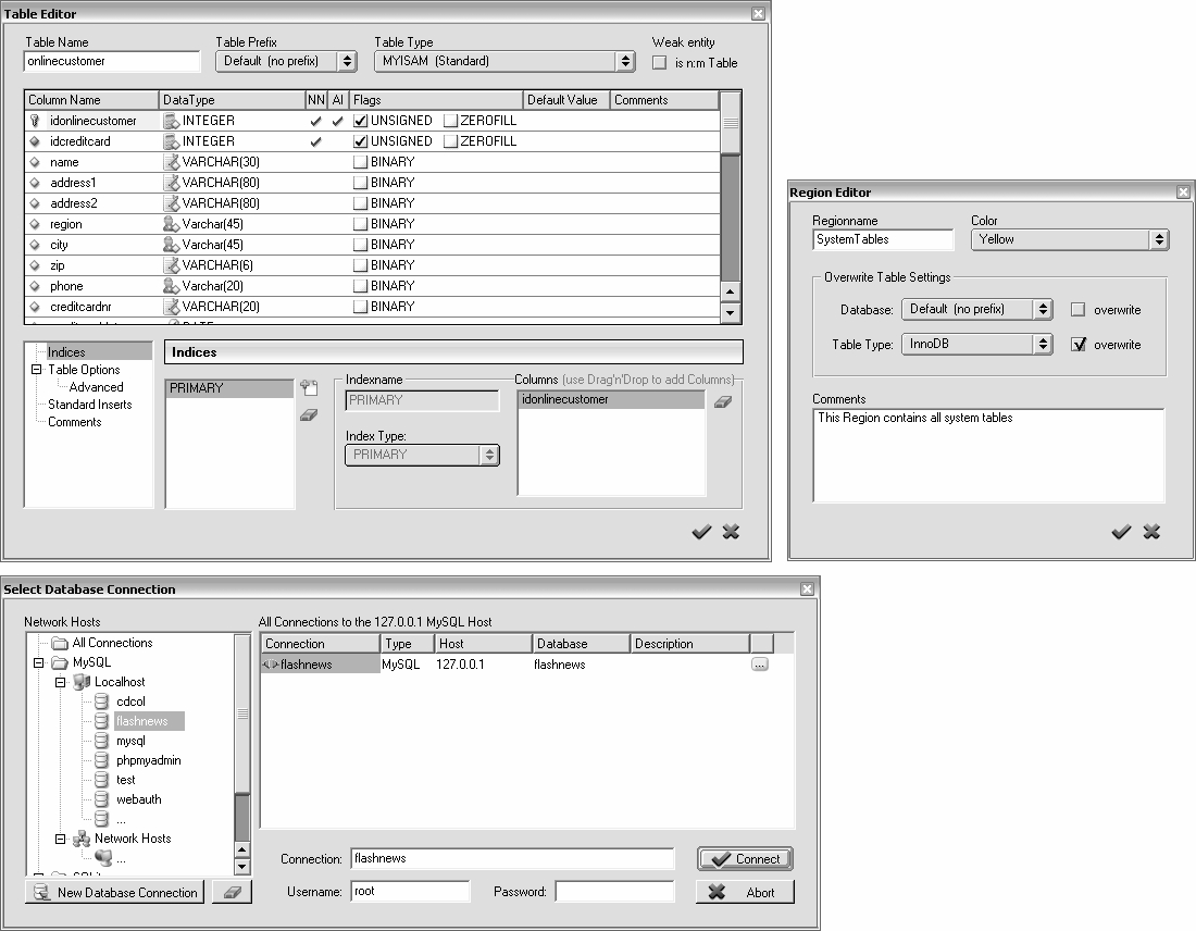Bild 2.32: Verwaltung von Datenbankverbindungen, Region- und Tabelleneditor