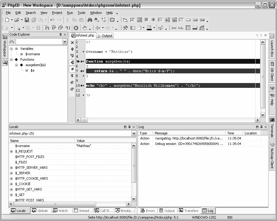 PHPEd von NuSphere steht dem Zend Studio in nichts nach. Die Funktionen der PHP-Entwicklungsumgebung sind beeindruckend. Arbeitsprozesse wie umfangreiches Debugging oder Performancetest (Benchmarks) werden durch die IDE wesentlich erleichtert.