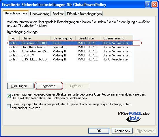 In neuen Fenster wählen Sie jetzt unter "Berechtigungseinträge" den Eintrag "Benutzer..." aus und klicken Sie auf den Button "Bearbeiten".