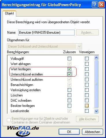 Wenn Sie das Energieschema von Windows auch als normaler Anwender verändern wollen, müssen Sie die Rechte des folgenden Registryschlüssels ändern: