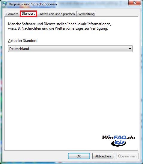 Mit diesem Tipp können Sie den Tabreiter "Standort" von "Regions- und Sprachoptionen" aus der Systemsteuerung entfernen. Wenn Sie den Tipp aktivieren, wird der Eintrag nicht mehr angezeigt, in diesem Bereich legen Sie den aktuellen Standort fest. Diese Einstellung wird für lokale Informationen von einigen Programmen ausgewertet.